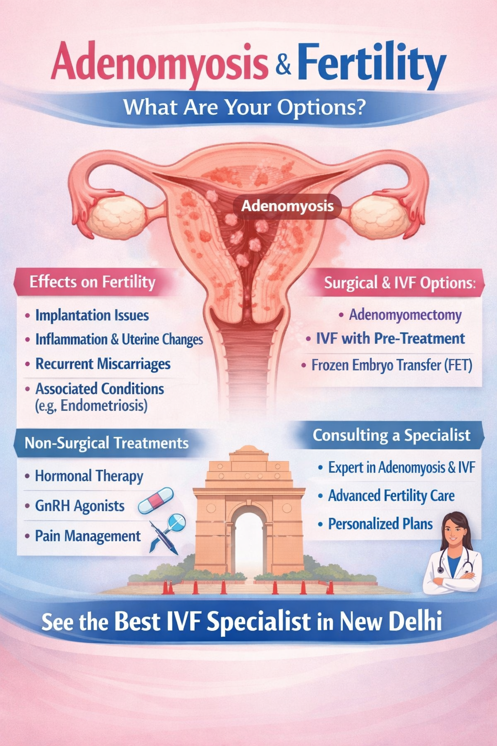 Adenomyosis can affect fertility — learn causes, diagnosis, medical and surgical options, IVF strategies, pregnancy tips, and when to consult the best IVF specialist in New Delhi